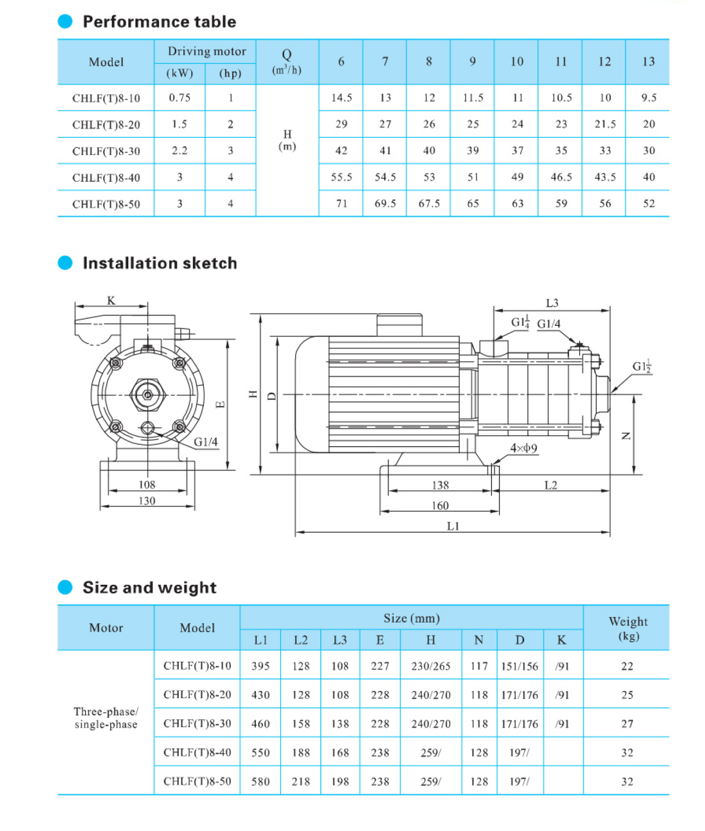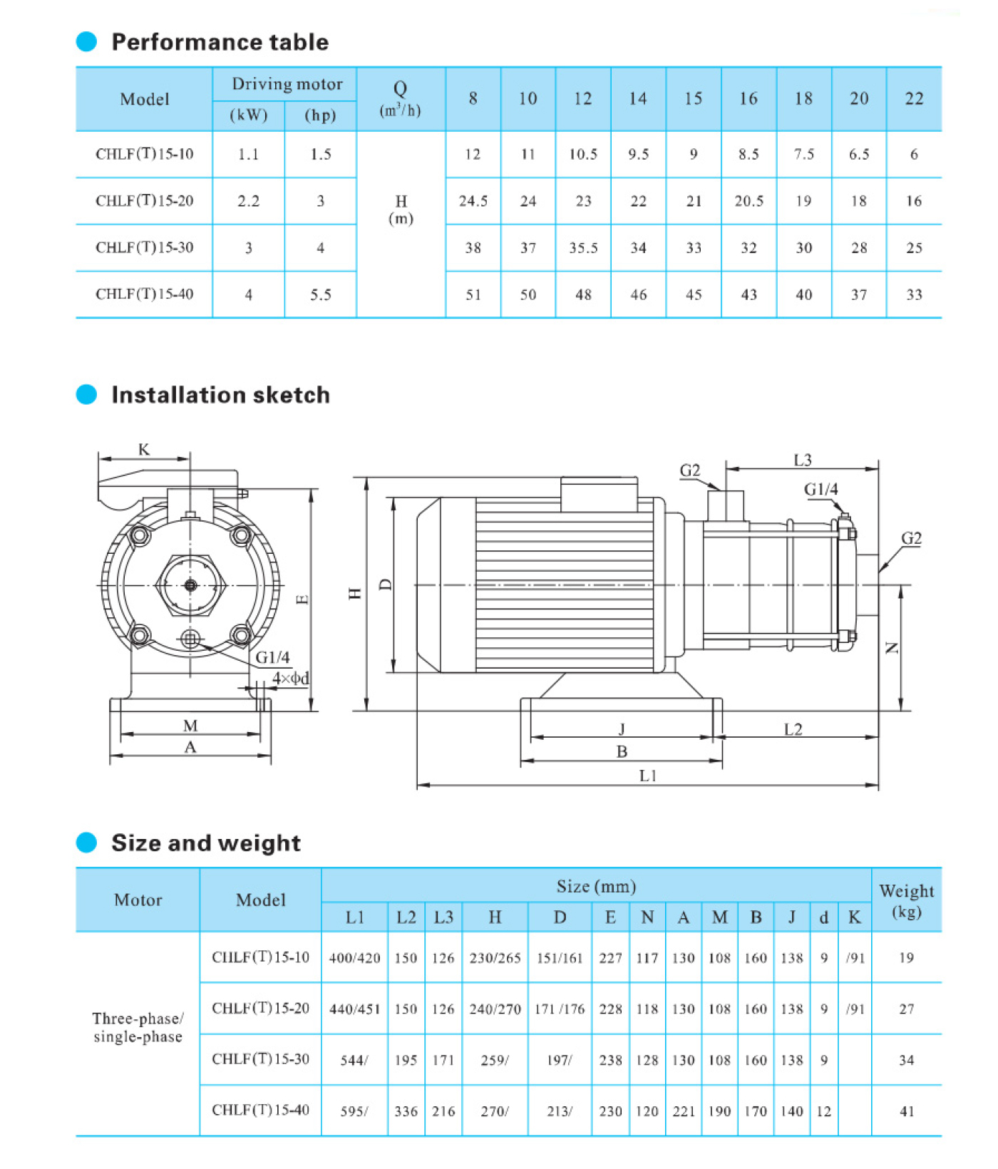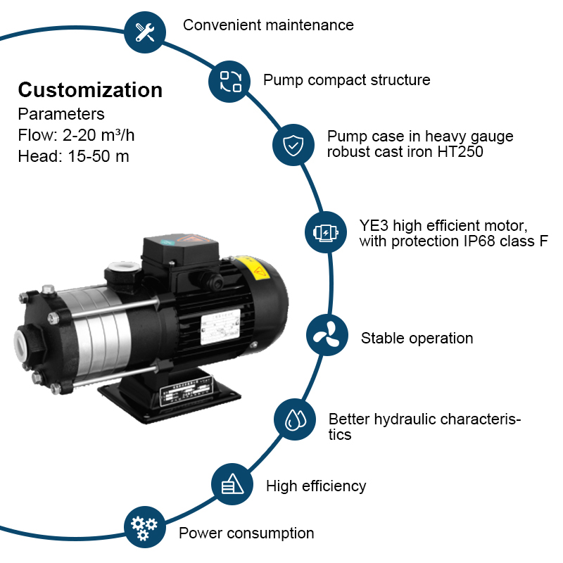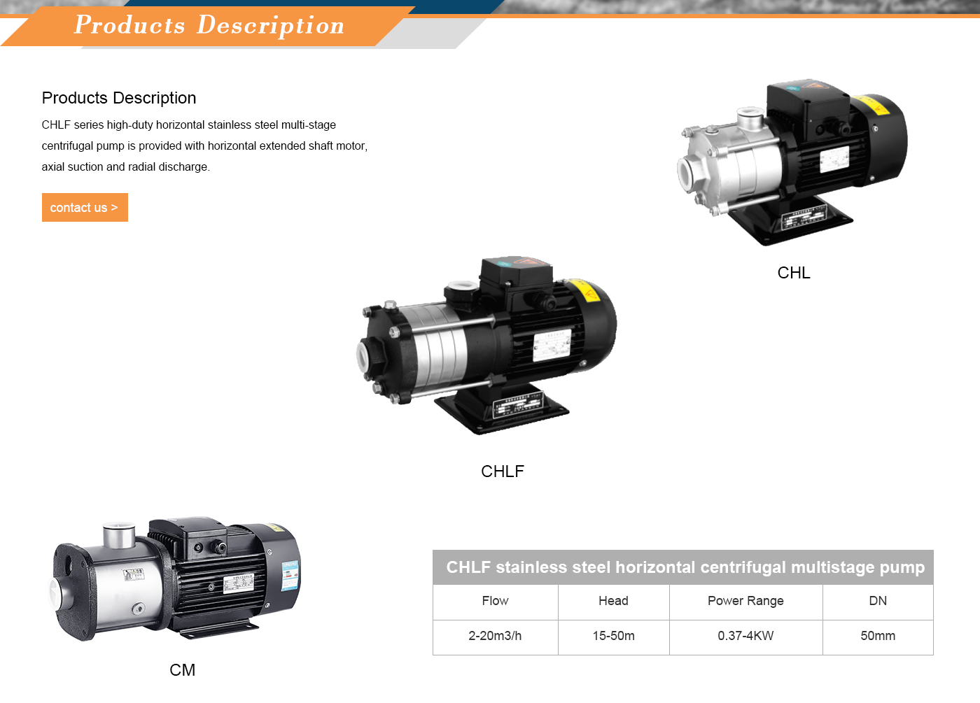 La pompa centrifuga multistadio orizzontale in acciaio inossidabile serie CHLF è dotata di motore ad albero esteso orizzontale, aspirazione assiale e mandata radiale.