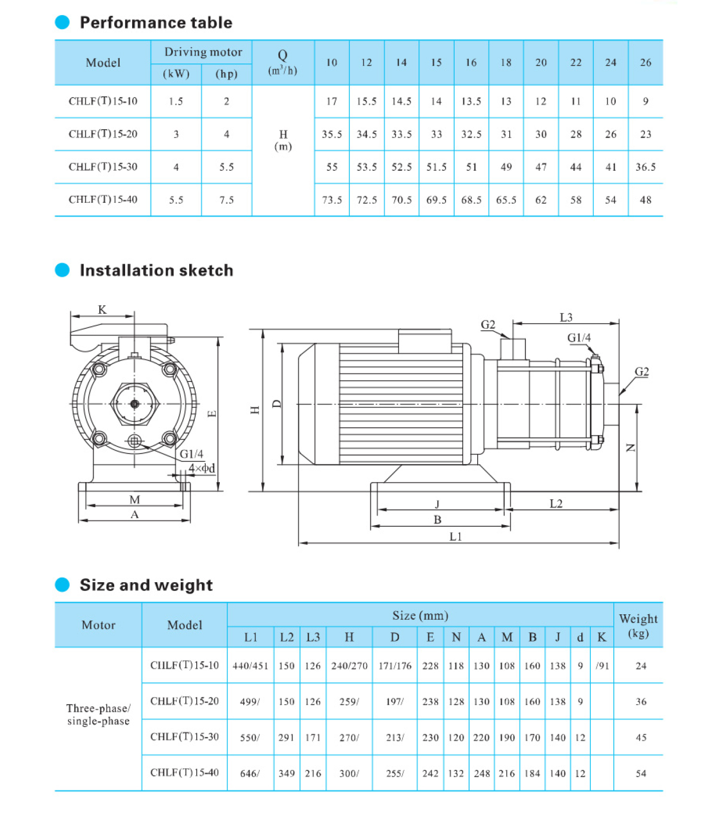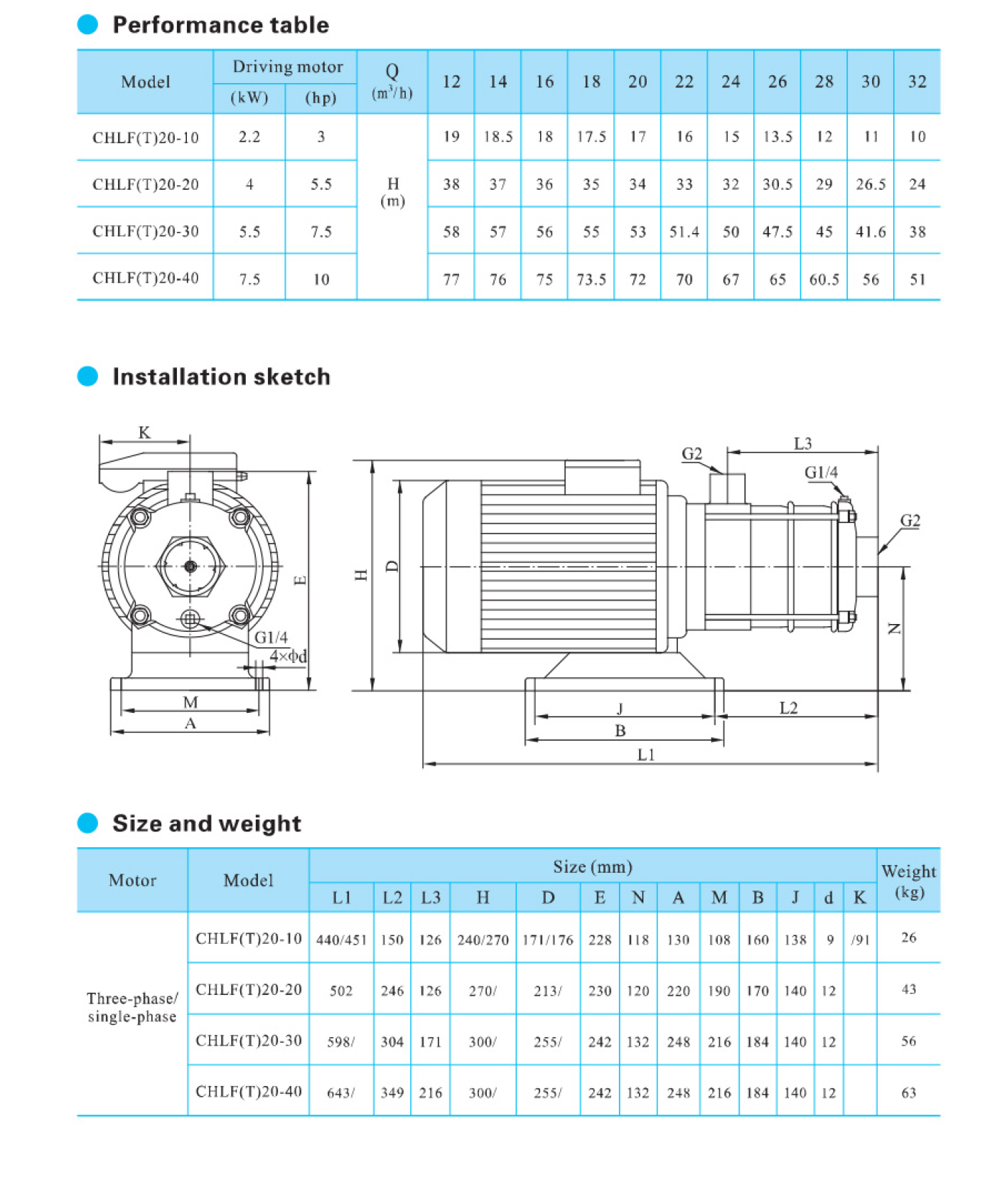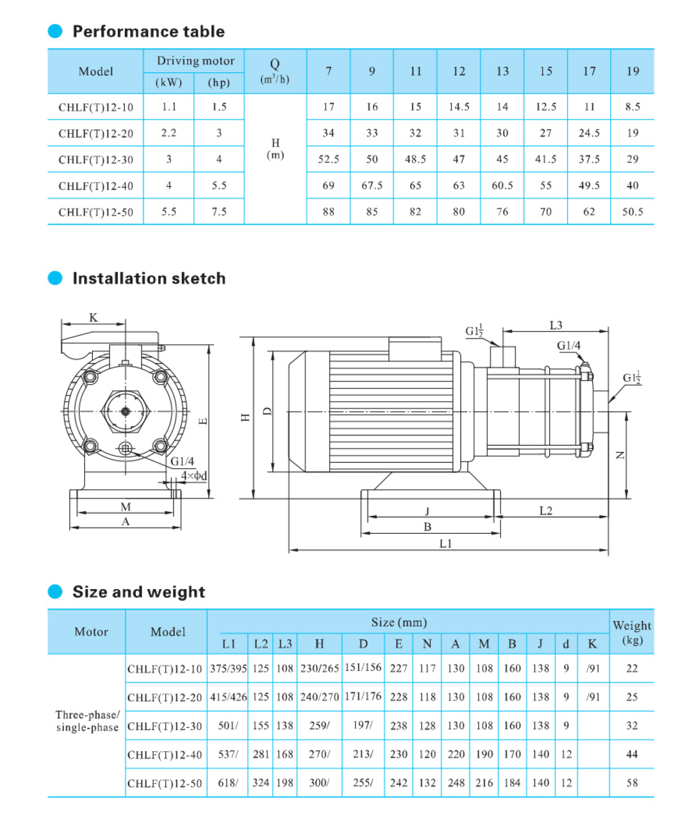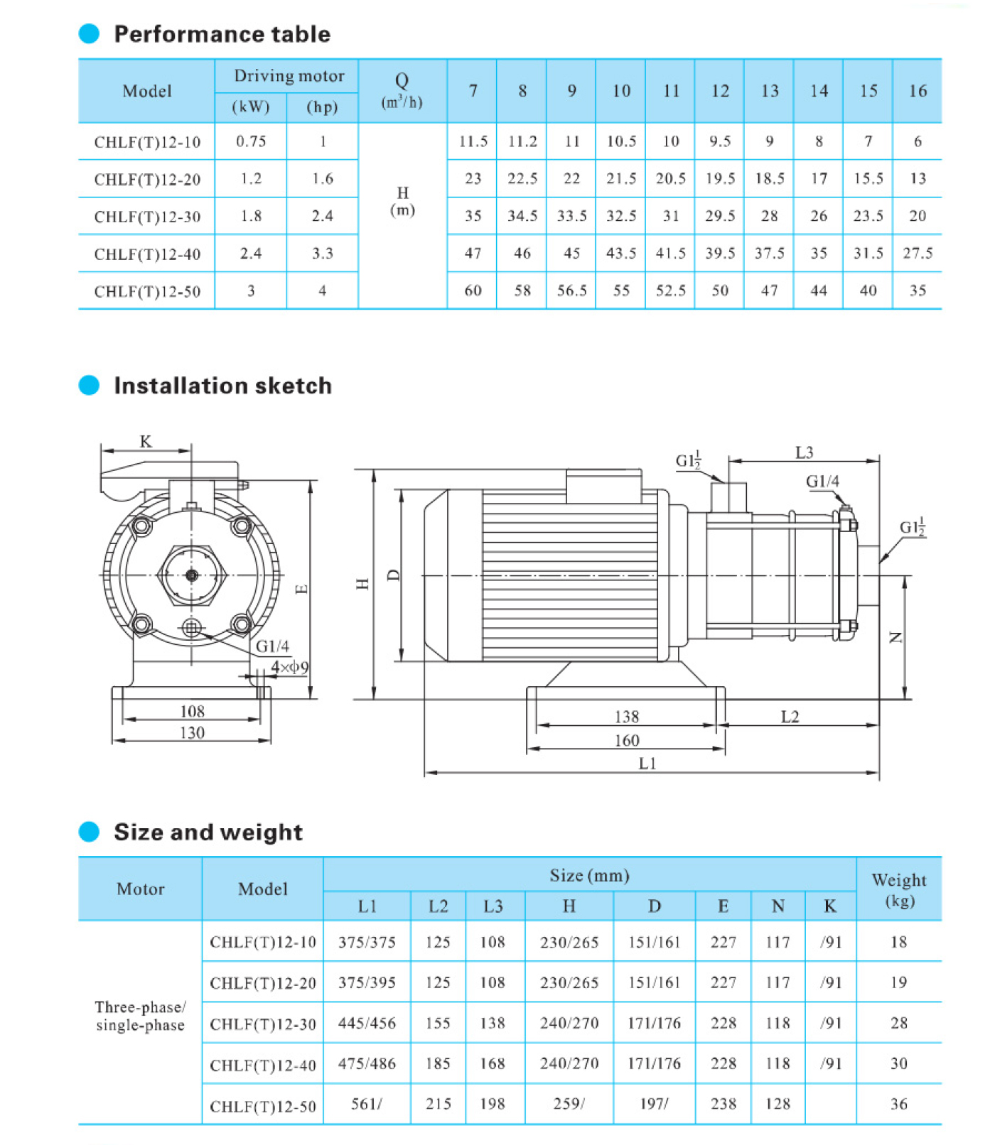 La pompa centrifuga multistadio orizzontale in acciaio inossidabile serie CHLF è dotata di motore ad albero esteso orizzontale, aspirazione assiale e mandata radiale.