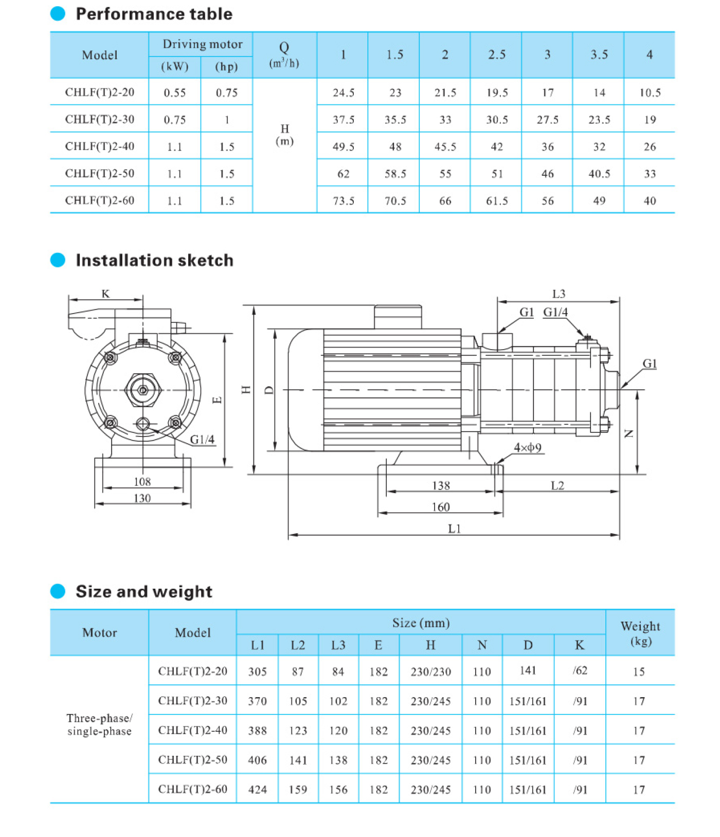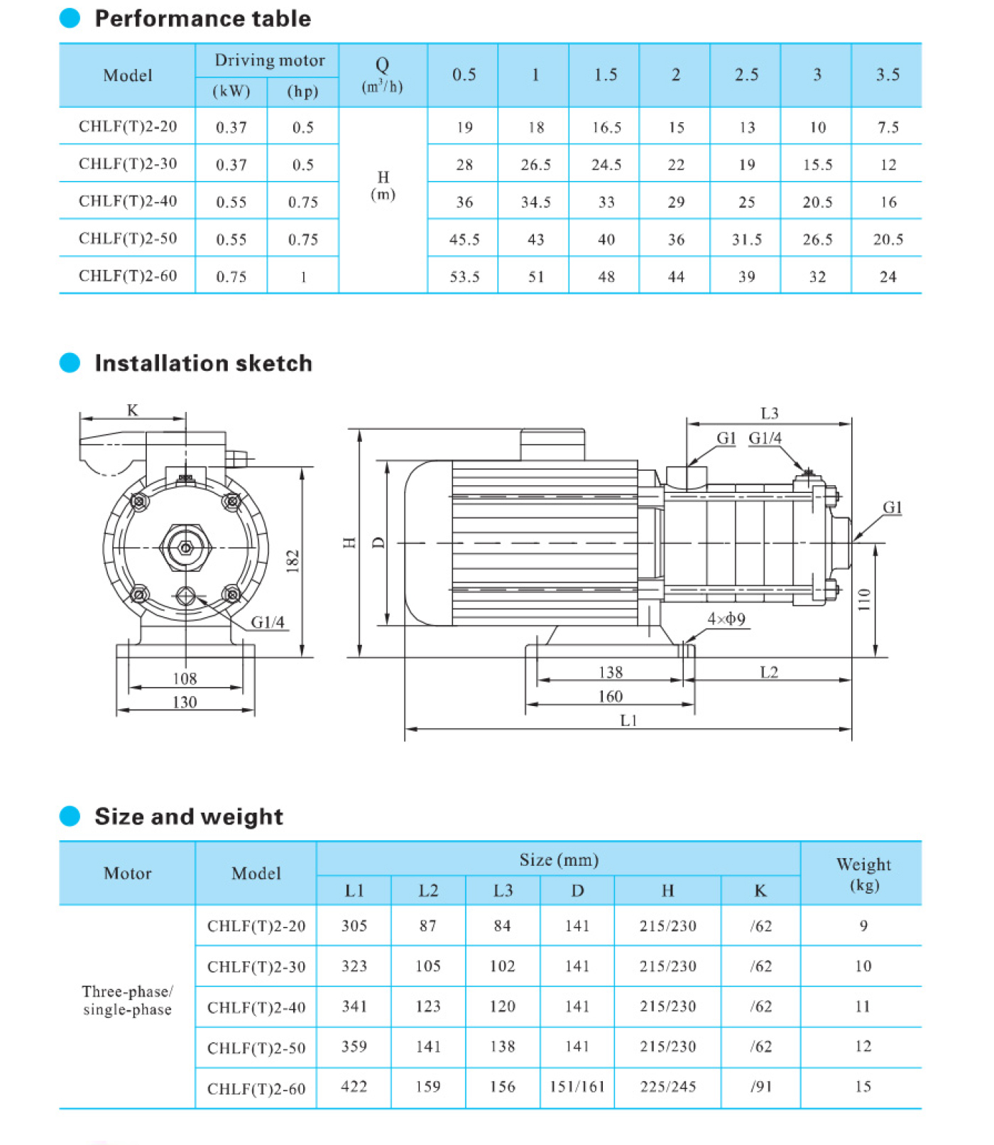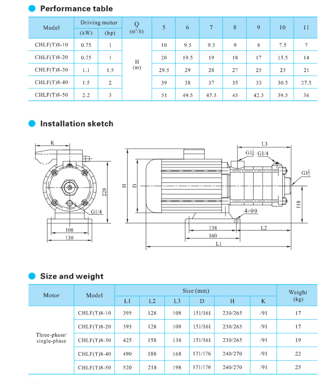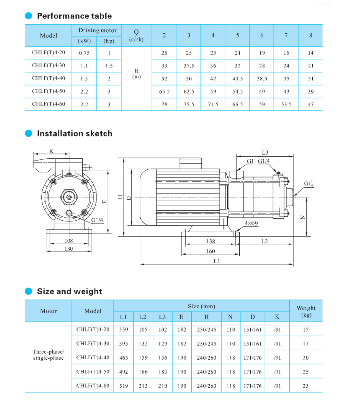 La pompa centrifuga multistadio orizzontale in acciaio inossidabile serie CHLF è dotata di motore ad albero esteso orizzontale, aspirazione assiale e mandata radiale.